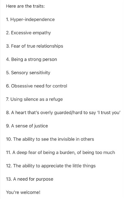 This was from a Jacqui Devoy post on Jung. Neither Freud nor Jung are on my faves list, neither is Piaget nor Bloom ... but Jung at least makes sense below in listing traits of people who have suffered much over a long period of time. I don’t mean half the newly invented conditions labelled to permit lingering and hypochondria but more where there is real trauma, as in shellshocked veterans.